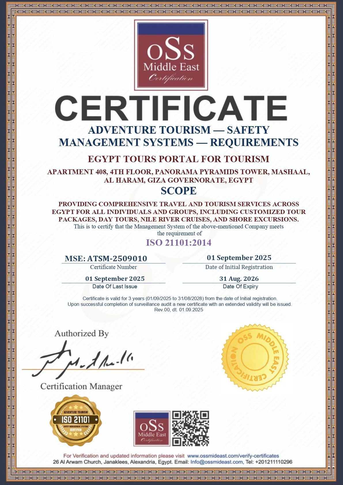 Egypt Tours Portal foi certificado pela ISO 21101:2014 (Turismo de Aventura, Sistemas de Gestão da Segurança), devido à sua capacidade de oferecer um sistema de segurança baseado no ciclo Plan–Do–Check–Act (PDCA), com política e objetivos de segurança documentados, conformidade legal e regulatória, identificação de perigos e avaliação de riscos, controles operacionais, preparação e resposta a emergências, avaliação de desempenho e melhoria contínua.