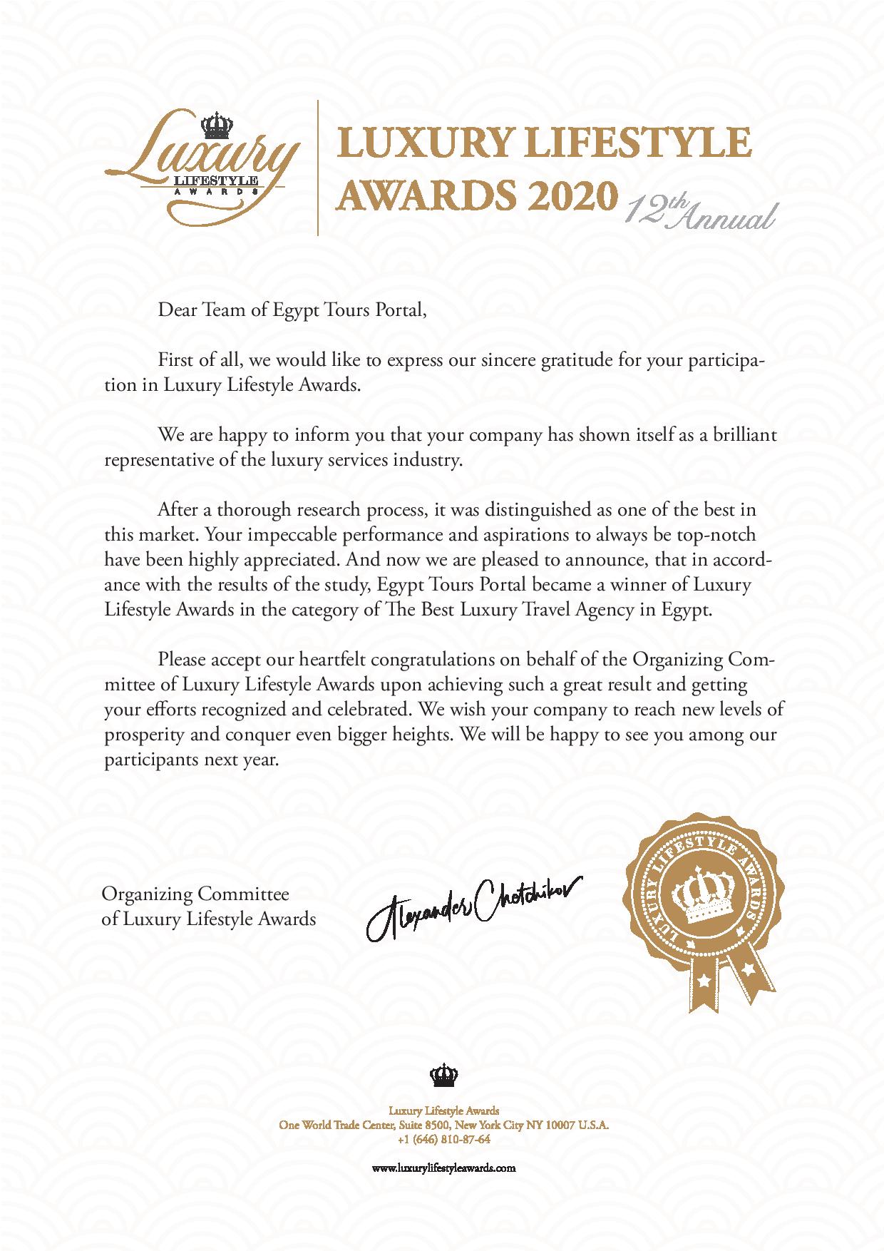 Fomos honrados com a recomendação do Luxury Lifestyle Awards em 2020, garantindo a você uma experiência de luxo incomparável durante sua viagem ao Egito.